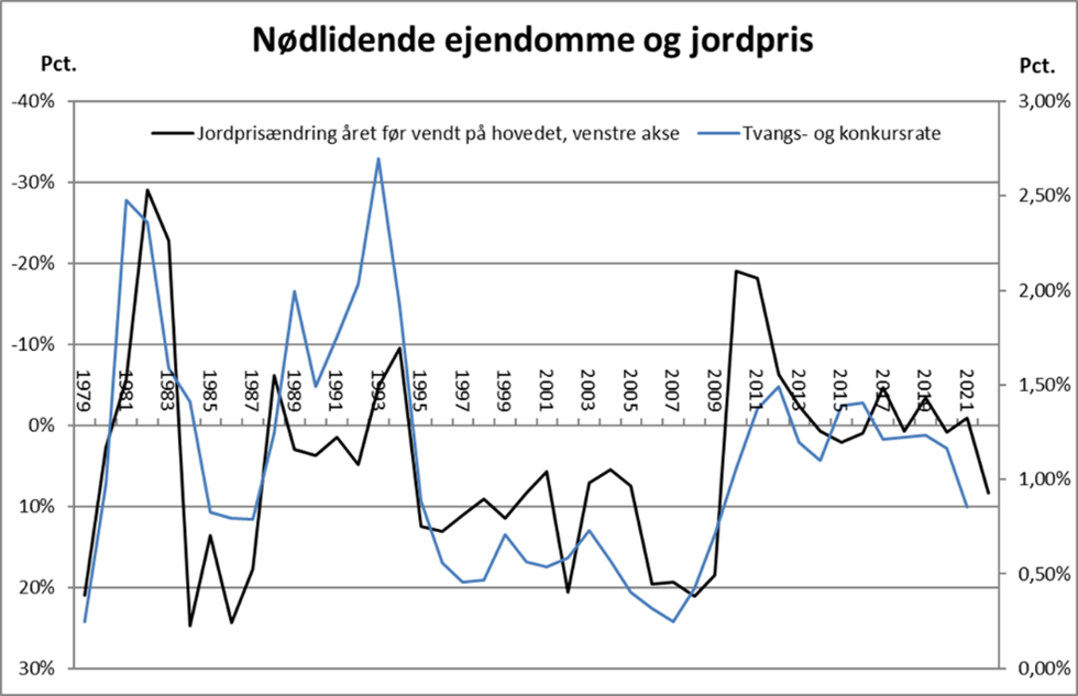 Der er kæmpe sammenhæng mellem nødlidende ejendomme og prisudviklingen på jord. Nødlidende ejendomme bregnes som konkurser plus tvangsauktioner holdt oppe mod antal bedrifter over 15 ha. Den nødlidende rate har lagt forholdsvis højt siden 2009 frem til 2019. Der er nu sket et markant fald i nødlidende ejendomme, hvilket understøtter, at den jordprisstigning der har været i 2021, må være mere vedvarende. I øjeblikket er en del svineproduktioner udfordret, men generelt set i Dansk Landbrug er situationen langt fra alvorligt. Derfor fastholder vi, at der bør komme gode stigninger på jordprisen de kommende år, som vi tidligere har meldt ud.