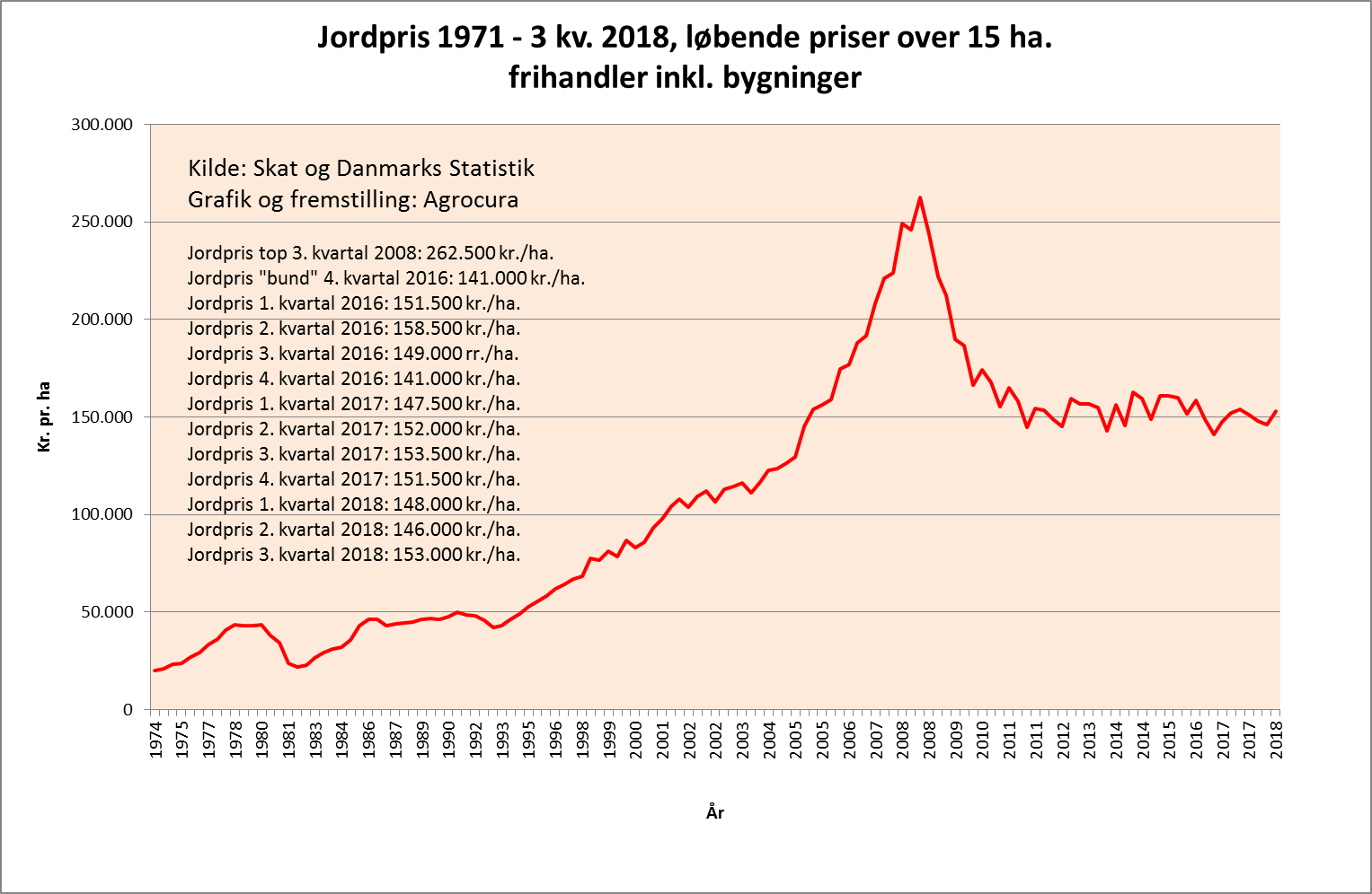 Jordprisen løfter sig til 153.000 kr./ha. i årets tredje kvartal mod sidste kvartals jordpris på 146.000 kr./ha. Det er som altid inkl. bygninger og frie handler. Det er et vægtet gennemsnit på landsplan. Danmarks statistik reviderer to kvartaler tilbage (gør de stort set med alle dataer i deres statistikbank), men denne gang er der revision i hele 2017. Det medfører, at jordprisen har ændret sig i niveauet 1.000-2.000 kr./ha., i de enkelte kvartaler.