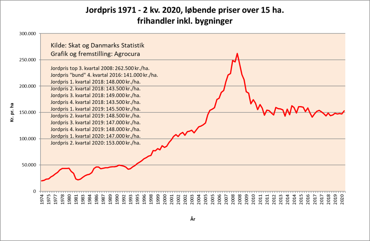 Det er kun en mere aggressiv udvikling (disruption) i teknologiske fødevare der kan ændre udsigten til markante prisstigninger. Jordpris er defineret som inkl. bygninger, da Danmarks Statistik altid har opgjort det sådant. Dagens konjunkturskriv omhandler ejendomsmarkedet, specielt jordprisen.