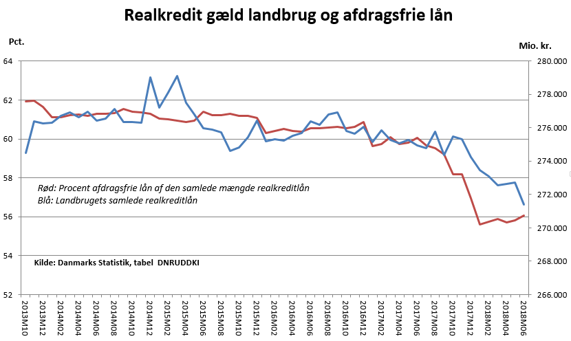 Nedenstående graf viser udviklingen i landbrugets gæld, herunder de afdragsfrie låns andel af den samlede gæld.