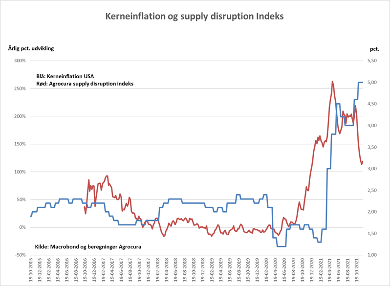 Derfor har vi i Agrocura kigget nærmere på inflationsvendingen. I vedlagte graf ses kerneinflationen (uden energi- og fødevarer) i USA, som p.t. ligger på 5,0 pct. Vi har i Agrocura udarbejdet et Supply Disruption Indeks. Indekset indeholder Sydkoreas chippriser, Tysklands gaspriser, kinesiske kulpriser og fragtindeks (BDI). Der er over 70 pct. sammenhæng til kerneinflationen. Supply Disruption Indeks leder kerneinflationen med 3,5 måneders forsinkelse. Supply Disruption Indeks har igen sat en top i uge 40 i 2021 og er faldet markant siden. Det betyder, at vi ca. slut januar bør se en vending i inflationen. Og det bliver en markant vending.