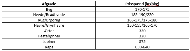 I løbet af de seneste 3-4 måneder har vi set relativt store prisstigninger på både havre, rug og byg, hvorimod hvede, raps og proteinafgrøder har ligget mere stabilt i et fornuftigt niveau. Gængse købspriser fra grovvareselskaberne er vist i tabellen nedenfor, mens der som udgangspunkt kan tillægges 15-20 kr. pr. hkg for salgspriser.