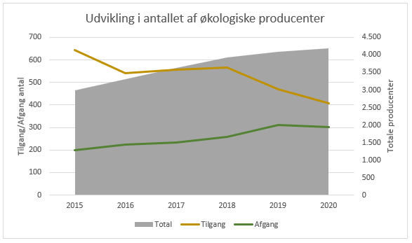På figuren herunder er udviklingen i antallet af økologiske producenter vist. Som det ses, er der siden 2015 sket en tilbagegang i antallet af omlægninger til økologi. Tilsvarende er antallet af tilbagelagte producenter steget, hvilket samlet set betyder at væksten i antallet af omlæggere har været aftagende.
