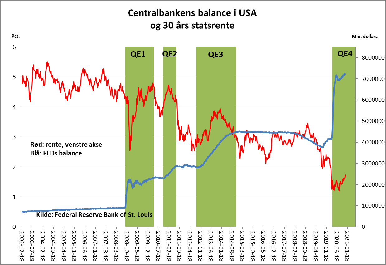 I vedlagte graf ses USAs centralbanks balance sammen med de fire hjælpepakker og den 30-årige statsrente.