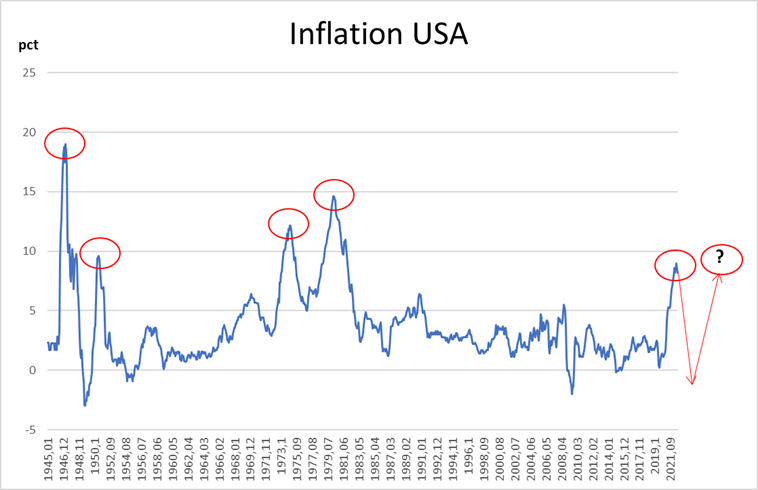 Det var tydeligt, at inflationen og renterne skulle stige efter Covid-19 jf. de penge- og finanspolitiske tiltag. Men jeg har ikke i min vildeste fantasi regnet med en inflation på 8 til 10%. Vi har kigget på forholdene og der er en vis sandsynlighed for at inflationen kommer igen, efter en tur i kulkælderen, før vi kan tale om 0-renter.