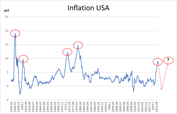 Det at inflationen falder lige så hurtigt vil betyde, at inflationen sommer 2023 igen er på plads. Vi forventer, at vi kan få en periode med negativ inflation. Den formentlige ekstraordinære forbrugsopbremsning vil trække råvarerne godt med ned, midlertidigt. Uden at kunne sætte tal på, så er der en vis sandsynlighed for, at inflationen kommer retur på de høje niveauer (næste gang er der nok ikke en krig med i spillet). Det betyder, at vi får en periode, hvor vi har mulighed for at lave afdækninger på rimelige niveauer på f.eks. energi før en ny stigning sætter ind. Efter den første stigning i inflationen i slut 40’erne falder inflationen under 0%. Der er en negativ inflation på 14 mdr. før stigning nr. 2 kommer. Det samme er gældende mellem første og anden oliekrise i 70’erne. Her er der en periode på ca. 1 år, hvor inflationen holder sig omkring 5% før stigning nr. 2 sætter ind.