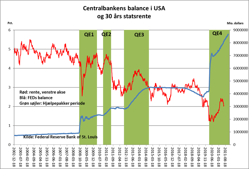 Det medførte kortvarigt stigende vækst, inflation og renter. Men hver gang opkøbsprogrammerne slukkede, faldt det hele ned igen - altså markant rentefald.