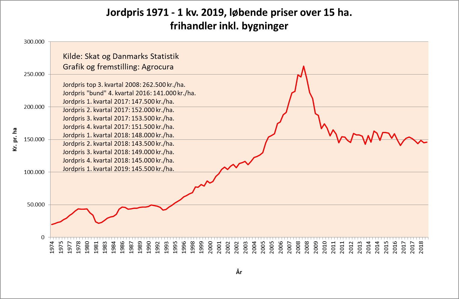 Der er blevet omsat 9.663 hektar i 1. kvartal 2019. Det giver en omsætningshastighed på 67 år, hvilket fortsat er det dobbelt af, hvad den historiske omsætningstalsagtighed er. Med de udsigter på indtjening og den lave renter venter vi en stigende omsætning de kommende år. Selvom der er meget til salg kan der gå stærkt (har historien tidligere vist) med at få omsat langt flere hektarer. Det vil være positivt for erhvervet og vil uden tvivl medføre stigende jordpriser.