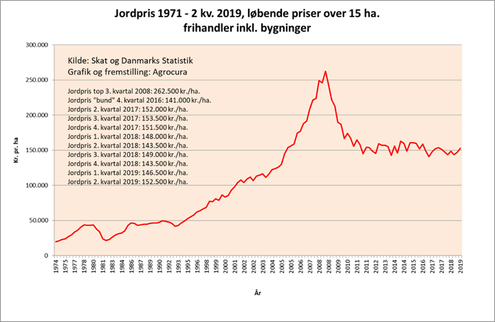 Jordprisen stiger til 152.500 kr./ha. for årets anden kvartal. Det er en stigning på 6.000 kr./ha. i forhold til seneste kvartal – se nedenstående graf, svarende til en fremgang på 4%. Det er som altid frie handler over 15. ha. inkl. bygninger, eksklusiv løsøre. Som altid er der større regionale prisforskelle og i og med omsætningen er lav, svinger prisen en del i de enkelte landsdele. De højeste priser findes fortsat i Vest- og Sydsjælland (inkl. Lolland Falster) på 205.500 kr./ha. De laveste priser er i Vestjylland på 117.000 kr./ha.