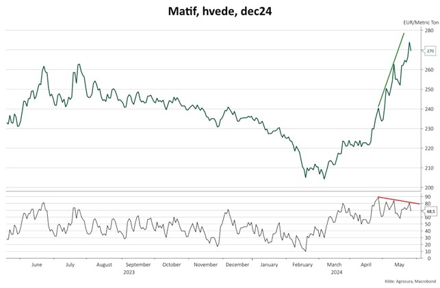 Lad os tage et konkret eksempel baseret på den nedenstående graf over prisudviklingen for hvede på Matif-børsen. Grafen viser prisen på hvede i EUR/ton over en periode fra juni 2023 til maj 2024, sammen med RSI-værdierne (nederst).