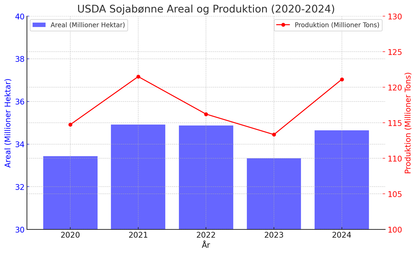 Overordnet set har denne sæson fået en rigtig god start i USA med gode etableringsforhold, som har gjort at de har været færdige med såningen tidligere end normalt. Denne tidlige etablering skyldtes de gunstige vejrforhold, som har skabt optimale betingelser for såning. Rettidige regnbyger og varme temperaturer har bidraget til, at mange landmænd har kunnet komme tidligere i jorden end sædvanligt, hvilket lover godt for resten af vækstsæsonen. For den kommende sæson forventer USDA at der er blevet tilsået cirka 34,64 millioner hektar sojabønner mod 33,33 millioner hektar sidste sæson. Med gode startbetingelser og et større areal er fundamentet for en stor høst lagt.
