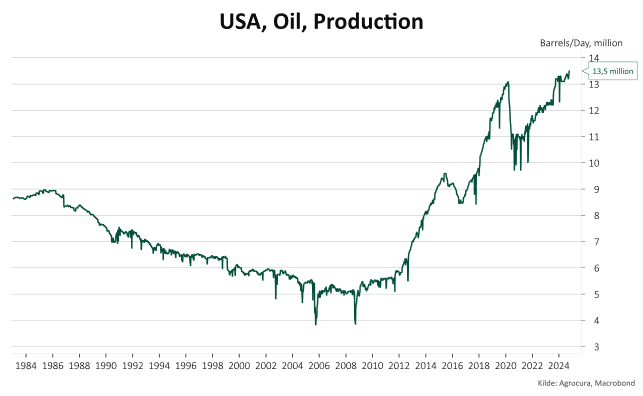Dette ændrede sig dog drastisk fra 2008, hvor indførelsen af fracking-teknologi muliggjorde ny produktion af skifergas og -olie. Som illustreret i grafen nedenfor førte denne teknologi til en markant stigning i USA’s olieproduktion, og landet opnåede hurtigt en position som verdens største olieproducent. Denne udvikling har gjort det muligt for USA at blive selvforsynende og en betydelig eksportør.