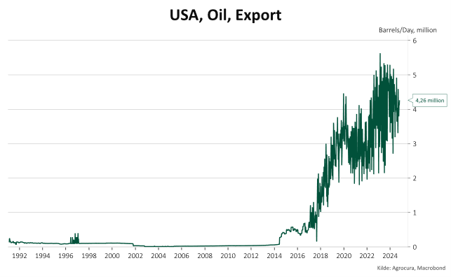 Grafen nedenfor viser udviklingen i USA’s olieeksport over de seneste årtier. Denne eksportøgning har haft en afsmittende effekt på de globale oliepriser og bidraget til en mere stabil forsyning. Eksporten har samtidig styrket USA’s indflydelse på energimarkedet, hvilket er et væsentligt aspekt i den nationale energipolitik.