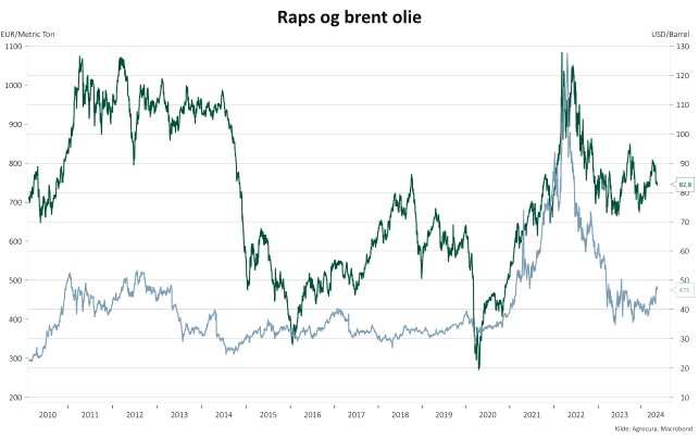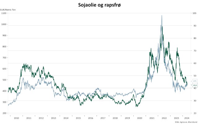 Figur 2: Priserne for raps og sojaolie siden 2010 og frem til i dag. Højre akse viser sojaolie og venstre viser raps.