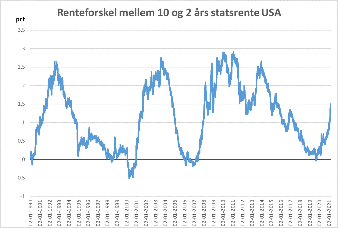 Kurven viser forskellen mellem den 10-og 2-årige statsrente i USA. Tilbage i 2019 oplevede vi kortvarigt, at den korte rente lå over den lange rente (kaldes invers rentekurve).