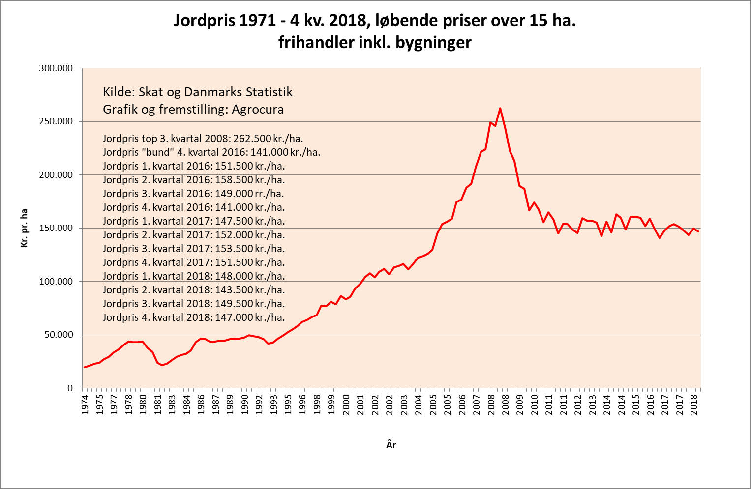 På ottende år ligger jordprisen sidelæns efter det dramatiske fald på over 40% i finanskrisen. Friske tal fra Danmarks Statistik for 4. kvartal 2018 viser en jordpris på 147.000 kr./ha., hvilket er et lille fald i forhold til 3. kvartal. Kontakt os, hvis du er interesseret i lokale forhold.