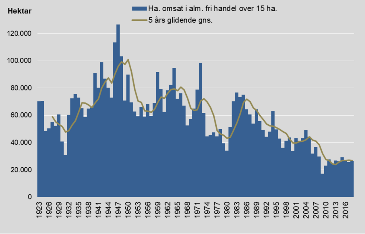 Ejendomsmægler beretter om udmærket aktivitet i landbrugshandlerne. Det afhænger af hvor langt bagud der måles. Set i et historisk perspektiv siden år 1923, bliver der ikke handlet mange hektar – se nedenstående graf. Under forudsætning af, at der ca. er 2.625.000 ha. på landsplan, så blev omsætningshastigheden 59 år i 2018. Siden finanskrisen i 2008 har den gennemsnitlige omsætningshastig ligget på ca. 62 år, hvilket er ca. det dobbelte af hele perioden tilbage til 1923. Derfor må konklusionen fortsat være, at landbrugserhvervet står overfor et uløsbart generationsskifte, hvor det er virkeligt vanskeligt, at få unge folk ind som ejer.