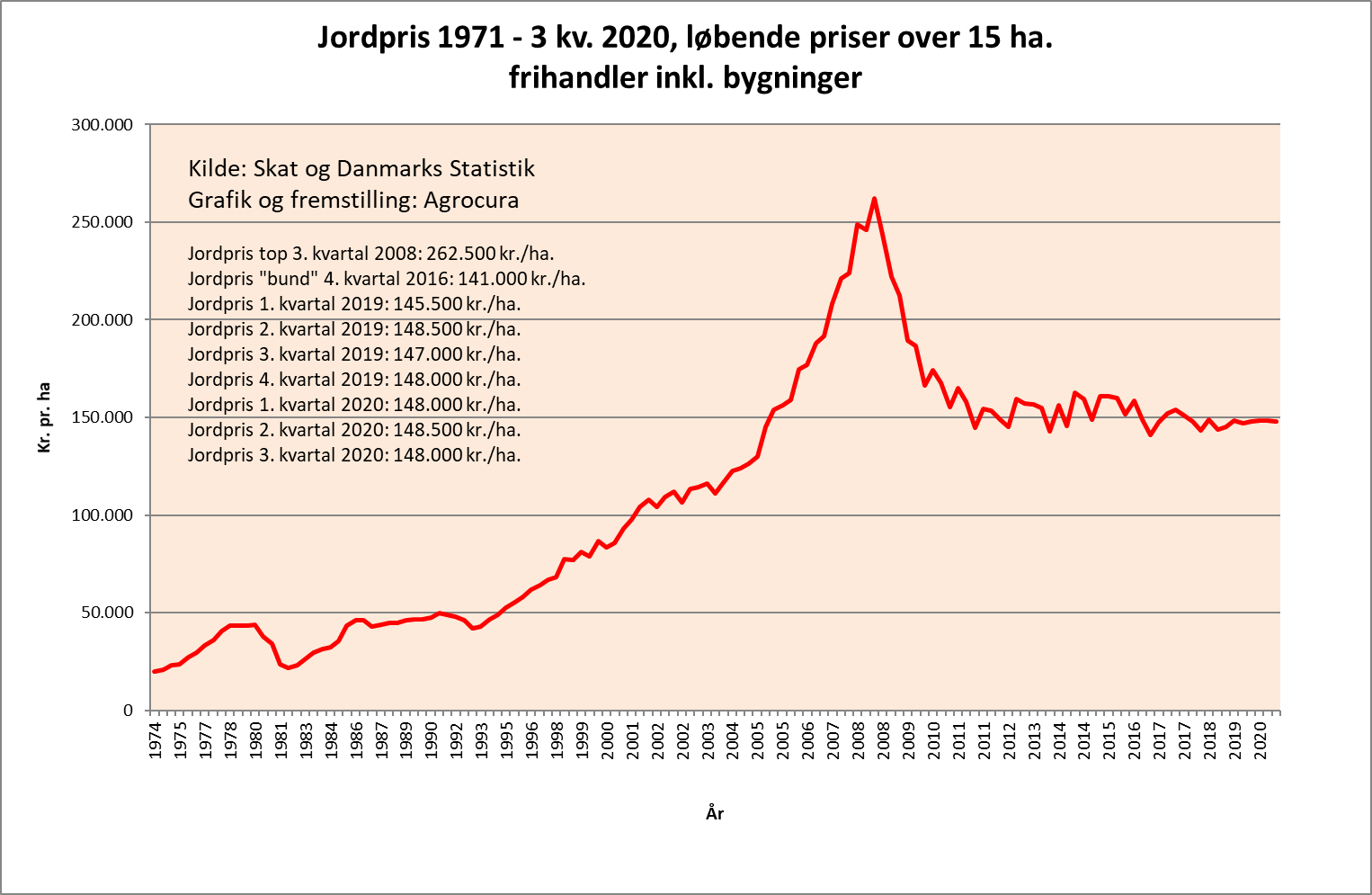 Lige nu er jordprisen uændret 148.000 kroner pr. hektar for tredje kvartal på landsplan, regnet ud fra frie handler med bygninger. Det betyder, at jordprisen ikke har rørt sig ud af flækken i 2020 modsat al anden fast ejendom.