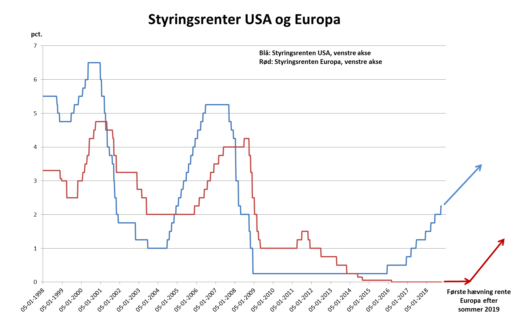 ECB slukker seddelpresseren til nytår, det er første skridt på en strammere pengepolitik. Væksten har det ok i Europa og arbejdsløsheden er stadig nedadgående pt. 8,1% og er lavere, end sidste gang ECB påbegyndte at hæve renten i slutningen af 2005 (sidste højkonjunktur). Vores konjunkturmodel peger fortsat på højkonjunktur på måske 2-3 år endnu. En af de ting som får fremprovokeret en recession er blandt andet stigende renter, hvilket pt. jo ikke er tilfældet endnu i Europa. Selvom inflationen er lav i Europa, så bør vi se, at den stiger, idet olieprisen peger klart op og, at lønningerne ligeledes har de største stigningstakter siden krisen. Stigningstakten i lønninger havde Mario Draghi også en kommentar på sidste gang han holdt tale, måske en indikation på, at renten nok skal bliver sat op i 2019.