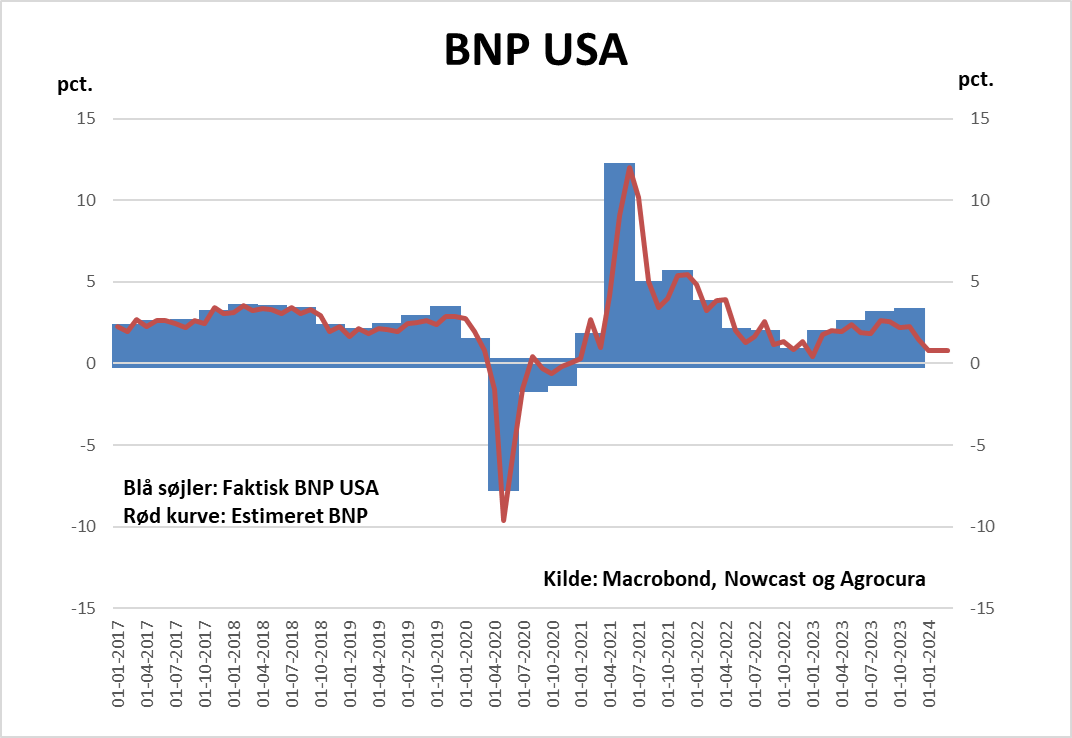 I vedlagte graf ses USA's BNP og estimat på BNP (rød kurve). Realtidsmålinger bliver mere og mere præcis. Og når vi så lige kigger på estimat til første kvartal 2024 på BNP i USA peger denne nedad. I forhold til overstående er bedste GÆT, (men også rimelig præcis nu), at USA rammer den økonomiske bund omkring 2 og 3. kvartal 2024.