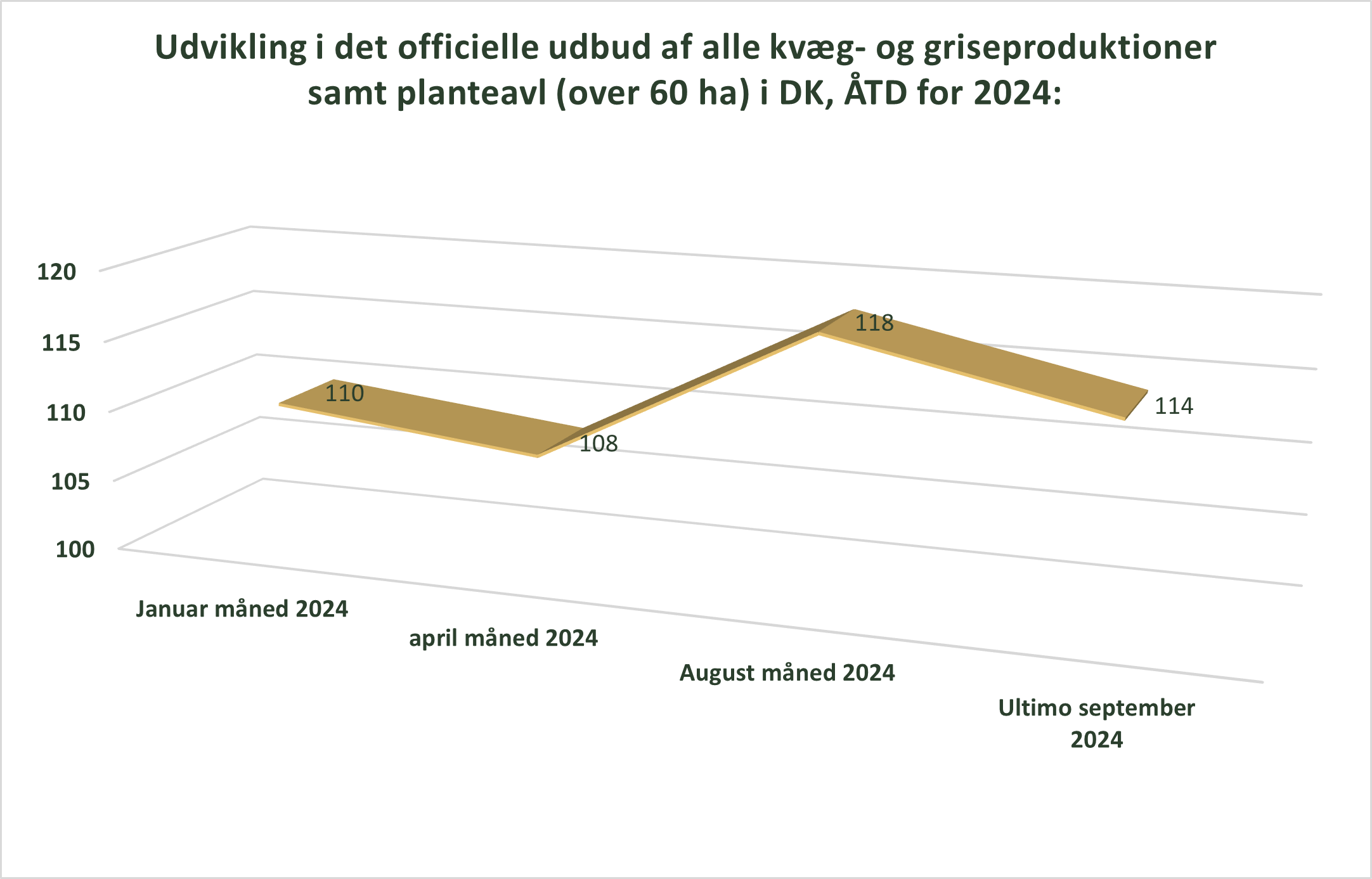 Udbuddet af landbrug til salg i DK, via landbrugssiden.dk, var ultimo september 2024 på samlet set 114 enheder, når alle kvæg- og griseproduktioner medregnes og alle planteavlsbrug over 60 ha indgår.