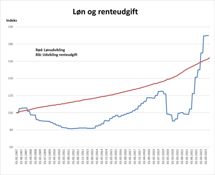 Med opbremsning i lønudviklingen, kigger vi som forbruger også ind i at en markant større andel af vores løn går til gældsservicering, og relativt mindre til forbrug. I denne uges graf ses den relative sammenligning siden 2007. Som det ses, er lønnen steget med 64 % i perioden, og indtil 2022 ligget pænt foran udviklingen i gælden. Det har tilladt forbrugerne at spare op eller forbruge. Siden 2022 er gældsomkostningerne som bekendt eksploderet og steget med 101 % siden 2007. Og da der jf. ovenstående lønudvikling ser ud til at komme en opbremsning her, vil det forventeligt også bremse økonomien lidt op som beskrevet til at starte med, og derved også tøjle inflationen, indtil centralbanken igen slipper foden fra bremsen.